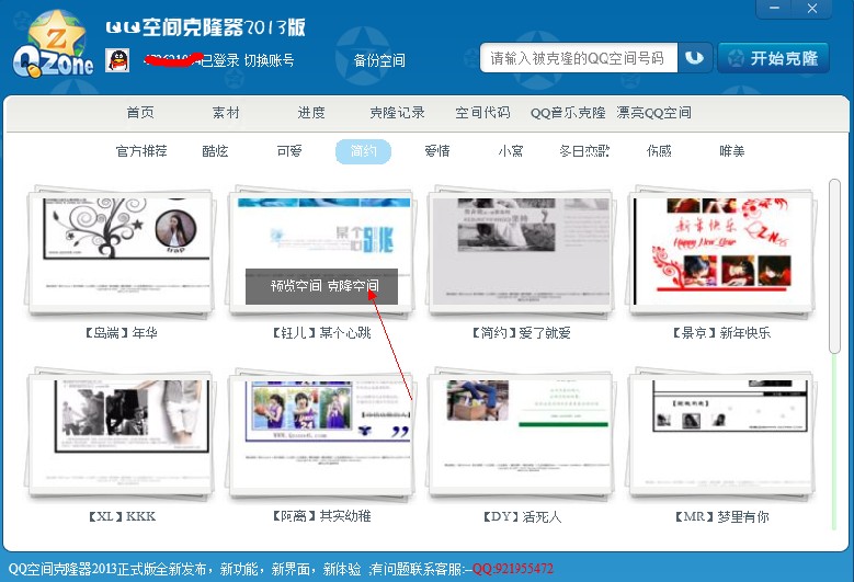 5、选择一套好看的QQ空间,或者输入别人的QQ号,进行克隆