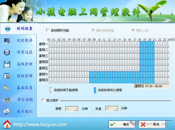 过滤不良网站展翅鸟家长控制软件综合采用了网页内容实时过滤、不良网址库过滤、搜索引擎关键词过滤等多种防堵方式,具有非常高的防堵准确率。同时,家长还可以手动添加不良网址、信任网址和自定义关键词,并可以方便地设置过滤灵敏度。展翅鸟家长控制软件全面支持中文简体、中文繁体、英、日、韩、俄、德、法、西班牙等多语种实时过滤的反黄软件,真正做到万无一失!控制上网时间家长可以选择一周7天,每天24小时内,哪些时段允许孩子访问互联网,哪些时段不允许访问互联网。在不允许访问互联网的时段,展翅鸟家长控制软件将自动挂断网络连接。按时限制聊天展翅鸟家长控制软件可以根据设定,按时间段决定是否允许聊天软件运行。按时限制游戏展翅鸟家长控制软件可以自动判断当前运行的程序中哪些是游戏。展翅鸟家长控制软件可以按时间段决定是否允许该游戏运行。按时自动关机家长可以设定每天孩子可以使用电脑多长时间。超过使用时间后,电脑将自动关闭。保护孩子视力家长可以通过设置视力保护功能,规定孩子每使用一定时间计算机,必须休息一段时间,以达到保护视力和身体健康的目的。推荐精彩网站我们为孩子精挑细选了一些有助于未成年人健康成长的优秀网站以供他们浏览,另外,您也可以自己添加和编辑这些网站。记录上网历史家长可以方便地查看孩子的正常上网记录和违禁上网记录。记录屏幕内容您可以选择按照一定的时间间隔记录孩子使用计算机时的屏幕内容,以督促孩子抓紧时间学习。