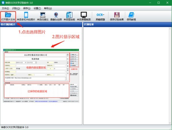 第一步:打开需要识别的图片,支持图片文件,手机图片,扫描仪图片,相机照片,剪贴板图片,截图。打开后,图片会显示在左侧的“图片显示区”,界面如下: