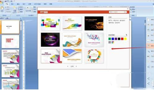 4.点侧边栏中的“更改”,首先将ppt更改为漂亮的模板,选择想要的模板,然后点右下角的“应用到文档”,查看ppt是否有较大的变化。