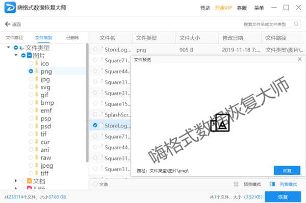 5.根据文件类型或文件路径形式,依次选择我们需要恢复的文件,双击预览,点击恢复。