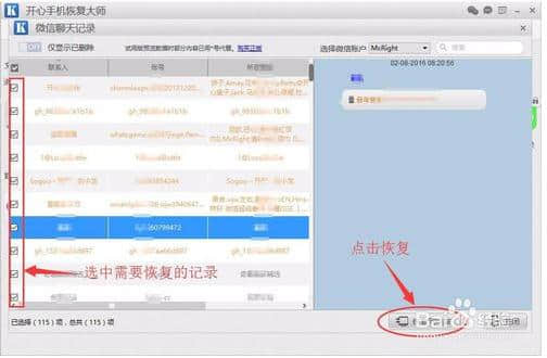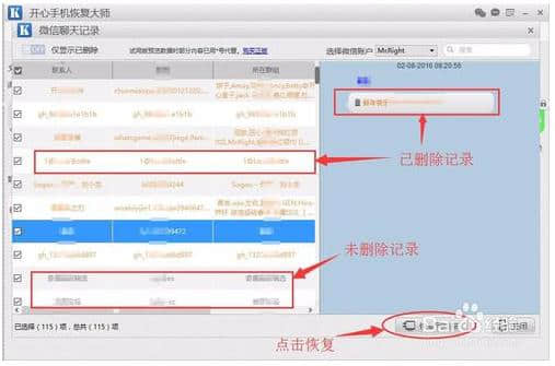 5.扫描后,软件进入微信聊天记录预览界面。在该界面可以预览微信聊天记录(橙色记录为已删除记录,黑色记录为未删除记录)。