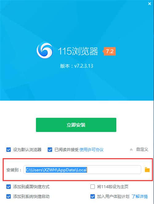 2.或者您可以单击[自定义]并单击文件夹图标。安装位置界面弹出后,可以自行选择115网盘的安装位置,选择完成后点击【立即安装】。