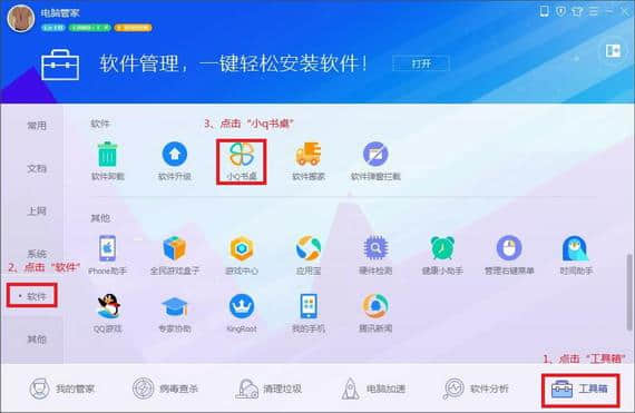 1.小Q书桌可以直接在网上搜索官网下载,也可以运行电脑管家后在工具箱中找到。