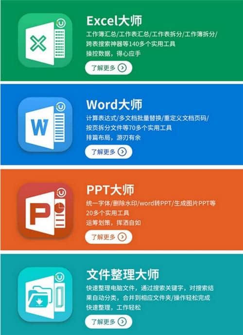 它包括五个模块:Excel、Word、PPT、文件备份和演示。拥有300种智能工具,配备线下动画教程,可有效降低Office软件学习成本,提高Office效率,支持Office和WPS。