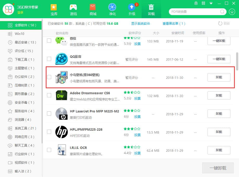 1.打开360软件管理器后,在界面顶部找到卸载选项,找到360壁纸软件。软件后面有一个一键卸载选项,用户点击一键卸载即可删除360壁纸软件。用户也可以使用电脑管家卸载小鸟壁纸,大致和360 Guardian一样。