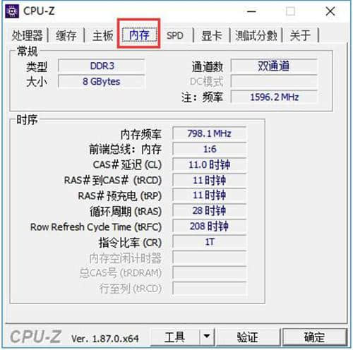 3.点击中文版CPU-Z顶部的【内存】,可以看到内存的相关内容。