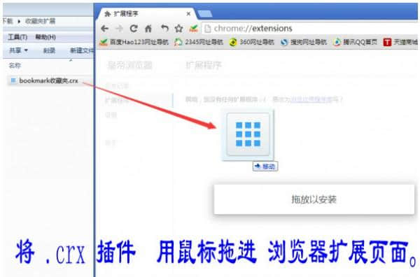 2.第二步:拖动下载的。用鼠标将crx文件拖入扩展页面。