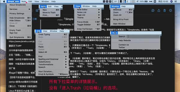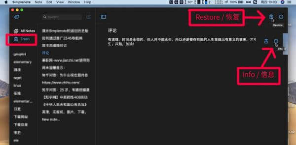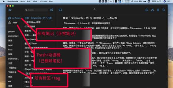 2.左上角的Show Sidebar是侧栏,在这里可以找到废纸篓标签,这里收集的所有笔记都会被删除。