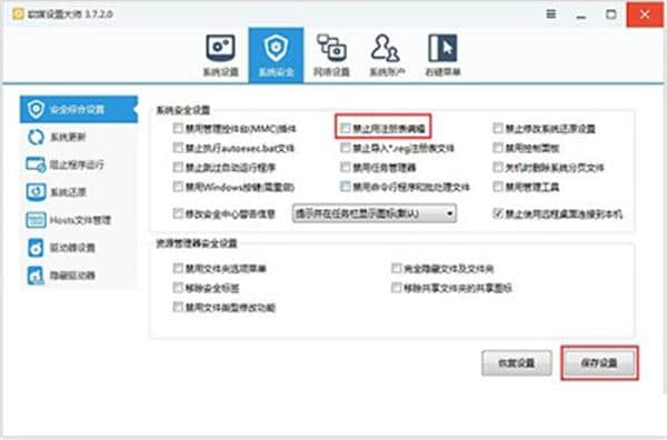 2.在软媒体设置窗口中,单击“安全性”。在安全标签下,您可以看到安全设置中“不使用注册表编辑”前面的复选框已被选中。