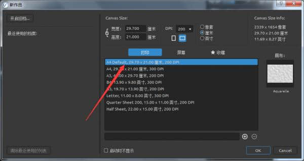 2.进入软件后,提示绘图界面的尺寸设置,纸张和尺寸可以在这里修改。