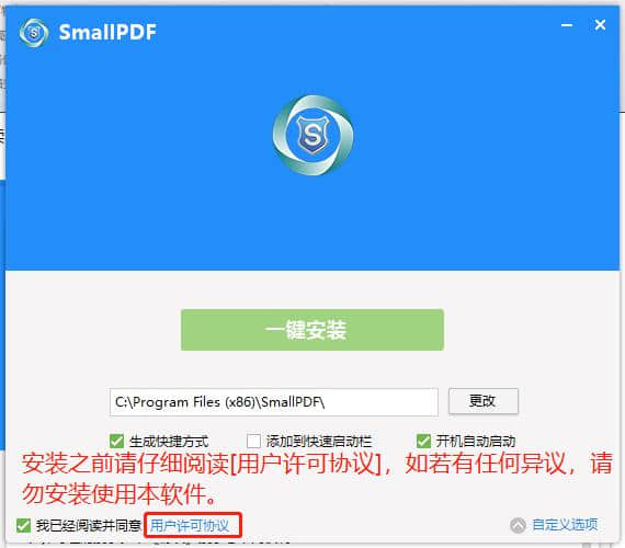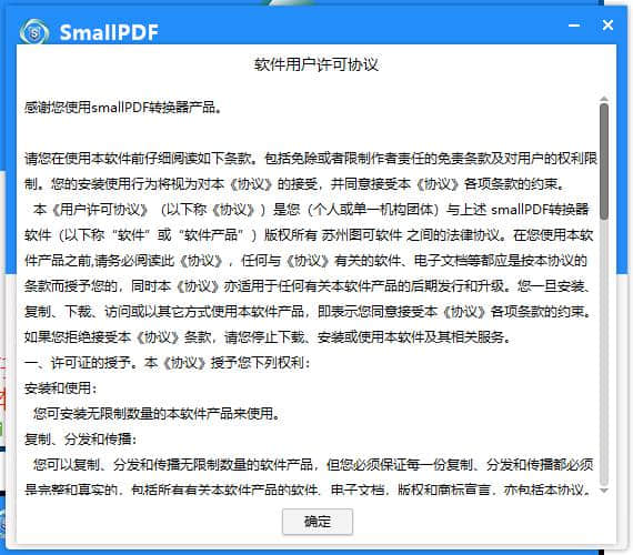 2.Smallpdf转换器可以选择直接安装软件【一键安装】三秒钟安装。请在安装前仔细阅读[用户许可协议]。如有异议,请不要安装和使用本软件。