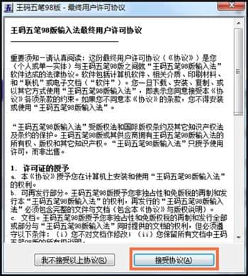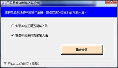 1.下载并解压。双击wbx98.exe程序进入安装界面。根据电脑选择的32位或64位王码五笔输入法点击确定安装。