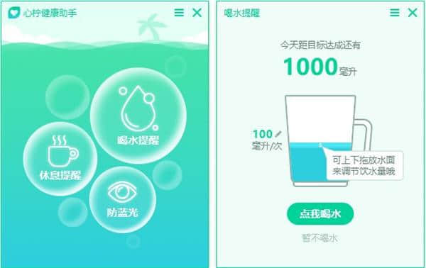 1.在桌面上快速方便地自定义所需的饮水提醒功能。