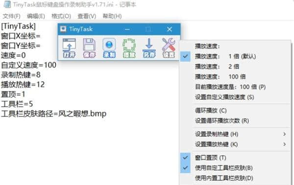 TinyTask软件下载后,可以使用软件快速记录键盘操作过程。TinyTask(键盘操作录制工具)各种不同的键盘操作功能可以更好的设置,也可以选择自己操作的倍速播放功能。记录各种脚本,记录和使用各种操作都非常方便,各种程序功能都可以快速设置。
