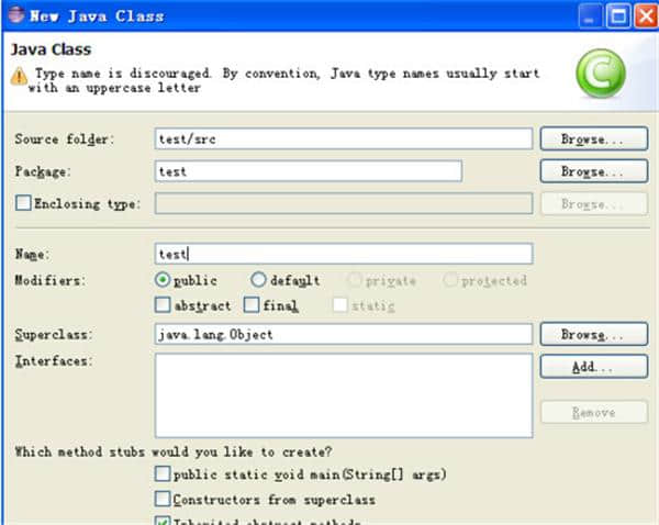 8.如图所示,键入类名,如test,然后单击finish。