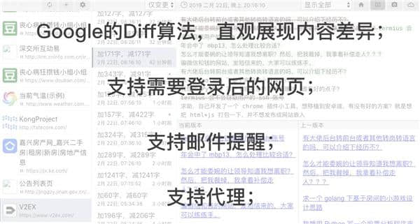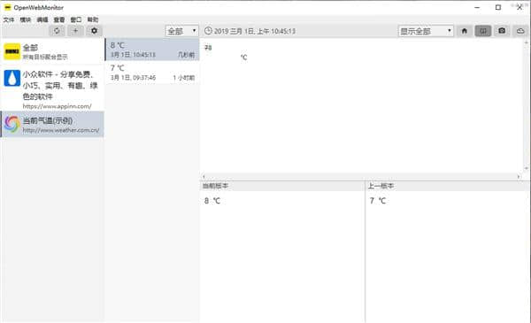 1.软件主界面左栏为监控任务列表,中栏为监控内容的历史变化记录,右栏为详细信息。