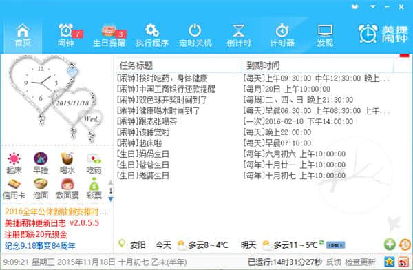 定时提醒:闹钟可以自定义提醒时段,也可以自定义文字。