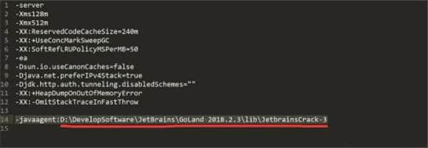8.在末尾增加一句:-javaagent:d:developerftwarejetbrainsGoLand2018 . 2 . 3 libjetrainscratch-3.1-release-enc . jar .添加的格式必须与下图一致(包括空行),其中红色下划线部分是您放置补丁的位置。