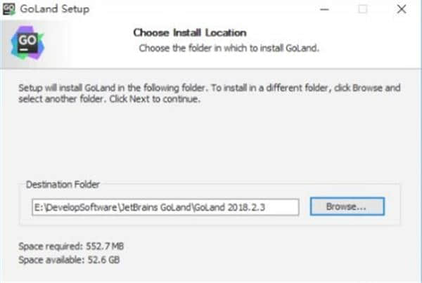 3.单击“下一步”并选择您自己的安装位置。我的安装位置是D:developerftwarejetbarksGoLand。