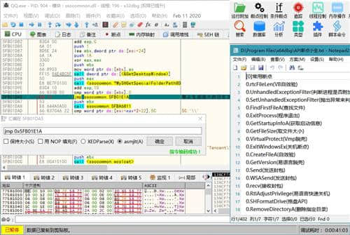 DLL和EXE文件的全功能调试,类似IDA的侧边栏和跳转箭头,模块和字符串的动态识别,快速反汇编,调试脚本语言自动化等诸多实用分析功能。