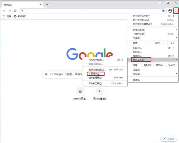 1.选择谷歌浏览器右上角的自定义和控制按钮,选择工具选项,点击扩展程序,打开扩展管理器界面。