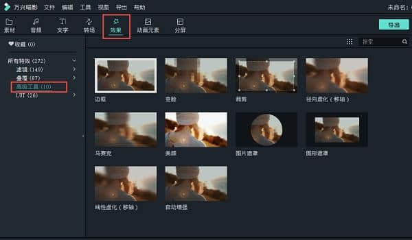 高级编辑工具包括轴移动效果、马赛克和面部变化效果。要使用高级编辑工具,首先点击界面顶部的“效果”按钮。在左侧栏的“过滤器”类别下找到“高级工具”,然后单击打开选项菜单。