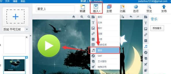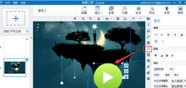 focusky如何选择更多?如果您想一次选中该框,您可以按住shift键,按住鼠标左键并拖动鼠标来选中该框。如果不容易操作,可以滚动鼠标滚轮缩小,然后再操作,这样更容易操作。您也可以按住shift键并逐个单击来选择要选择的对象。如何在聚焦演示中添加声音播放器?在focusky演示文稿中添加声音播放器非常方便。有两种方法:方法一:点击“音乐”快捷按钮,即播放器图标会立即出现。