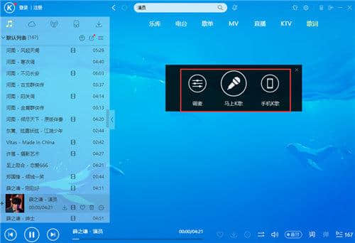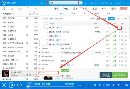 2.搜索您想要演唱的歌曲,单击[播放]标志,在要播放的歌曲中单击[更多]标志,然后选择[K歌]。