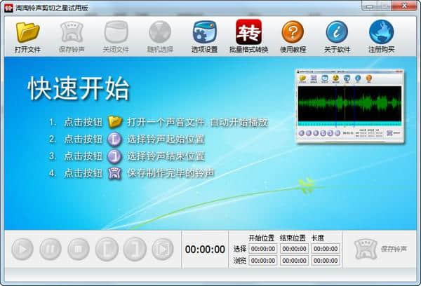 淘淘铃声剪切之星绿色版免费下载是影音软件分类超级好用的音频剪切电脑软件,创佳软件园小编给大家带来了淘淘铃声剪切之星下载以及软件相关信息,相信你正在寻找这样的软件,这款淘淘铃声剪切之星v1.6.122.0小编还亲测了使用过程,还等什么?赶快点击下载按钮免费下载吧!