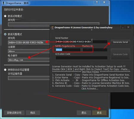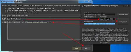 7.点击注册机中的【生成序列号】按钮,生成一组序列号,放入Dragonframe 4的注册框中,点击【激活选项】