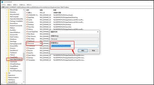 2.在弹出的注册表编辑器中,依次向左展开:HKEY _当前_用户软件微软 windows 当前版本浏览器用户外壳文件夹。在右侧找到[个人],双击将键值改为[% user profile % Documents];