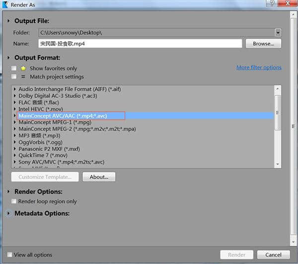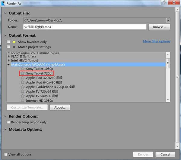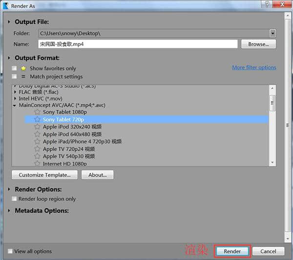 2.在“渲染为”的弹出属性对话框中选择输出的名称和保存位置。