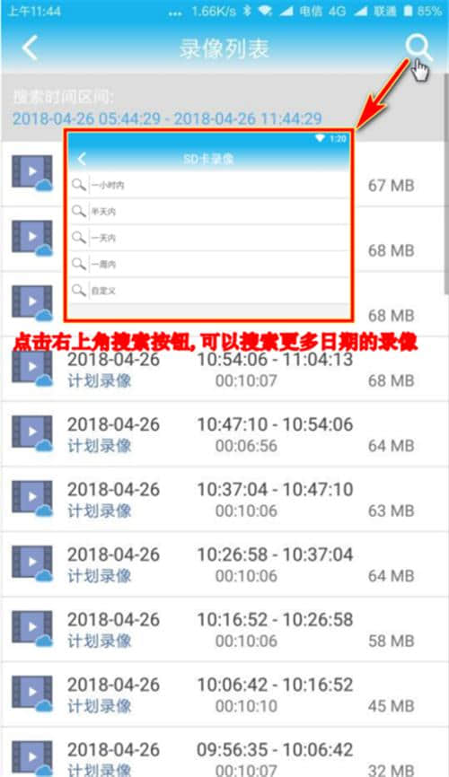 点击右上角的搜索图标,搜索相应的日期观看视频。