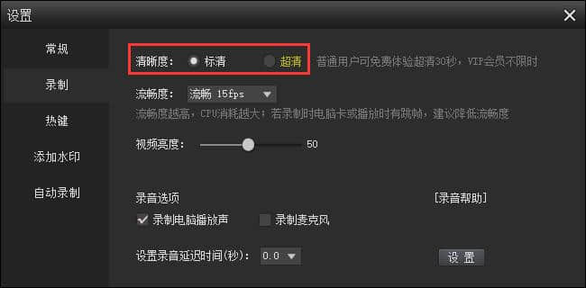2.用户可以点击图中所示的位置来选择记录图像的清晰度。
