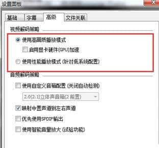 3.进入设置屏幕,选择“高级”。在解码策略中,取消“启用GPU加速”检查。最后,点击“确定”。