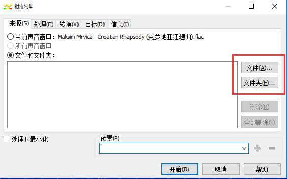 2.之后,批处理的新窗口将会打开。在窗口的右侧,您可以选择添加文件或文件夹。添加文件需要用户逐个选择文件进行添加。添加文件夹可以添加目标文件夹中的所有音频文件。以添加文件夹为例。