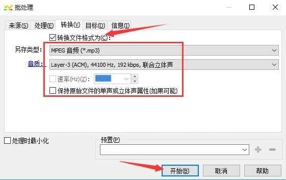 4.之后,我们将选项卡切换到“转换”功能。首先点击并勾选“转换文件格式”选项,然后在下方设置转换后的文件格式、音质等属性。完成所有设置后,单击下面的“开始”按钮开始转换。