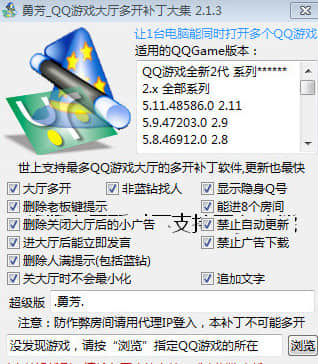 勇芳QQ游戏大厅多开补丁是一个用于QQ游戏大厅多开的补丁软件。玩家可以通过本软件不限制任意打开多个游戏大厅,登陆多个QQ号进入多个房间。是玩家升级,刷跟的必备工具。