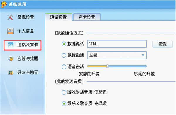 2.呼叫模式单击频道顶部的设置,选择呼叫和声卡来设置呼叫。