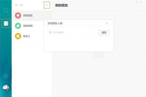 除了在PC端添加人,还可以在PC端添加好友和群聊。只需根据图示输入对方的小米ID或群ID,即可搜索需要添加的人和群聊天。