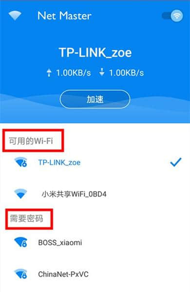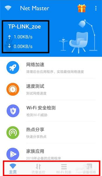 1.打开Net Master应用程序,主页顶部会显示Wi-Fi连接的名称和上传下载的速度。