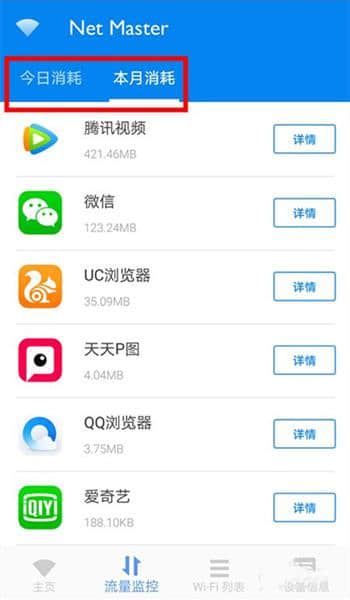 4.在流量监控中,可以查看应用消耗的流量,可以分为今天消耗和本月消耗两个选项。