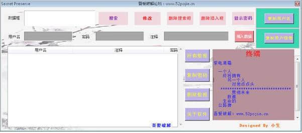 Secret Preserve免费版免费下载主要用于网络软件轻松管理网站密码,提供安全运行环境的电脑软件,创佳软件园小编给大家带来Secret Preserve下载和介绍,总体来说这款Secret Preservev1.05软件通常比较操作简单容易上手,是很多用户必备选择,欢迎大家下载!