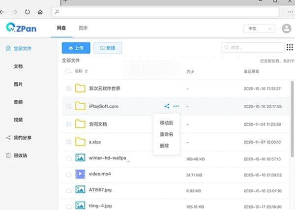 ZPan这是一个个性化的云盘服务存储中心,界面设计清新简约,还支持多种语言环境,为我们提供了非常有效的功能设备。ZPan它帮助用户带来安全的文件隐私。这里没有存储空间限制,也能在一定程度上减轻负担,给用户带来流畅的操作。