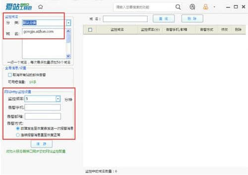 2.网站监控设置:可以设置监控频率的时间段,出现问题时报警至号码或邮箱;设置报警模式(从故障到恢复发送一次报警或从恢复持续报警)后,选择保存,实现网站监控。