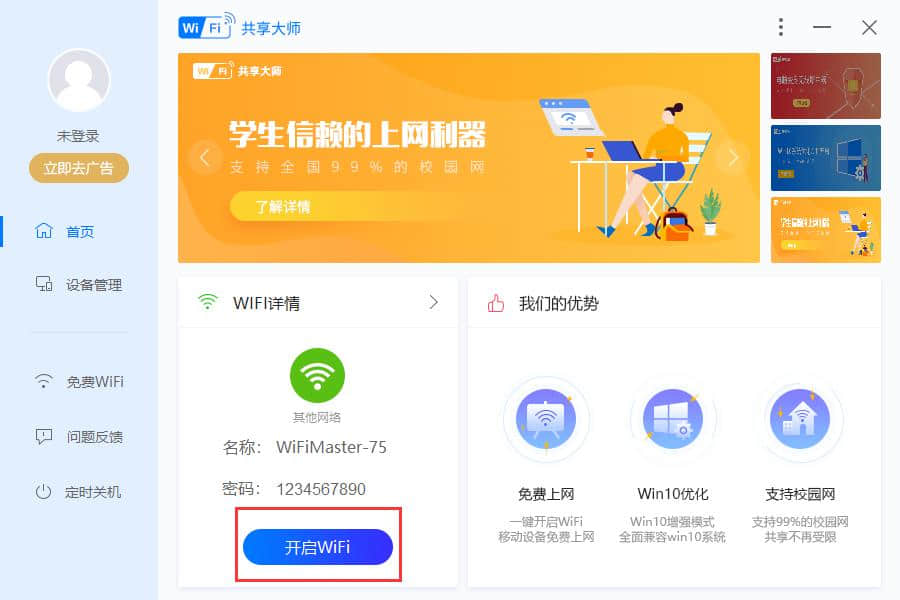 WiFi共享电脑版是一款非常简单易学的WiFi共享工具软件,它支持使用win7、win8、win10等。,支持全国99%的校园客户端。在校学生可以很容易地免费上网。