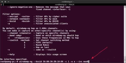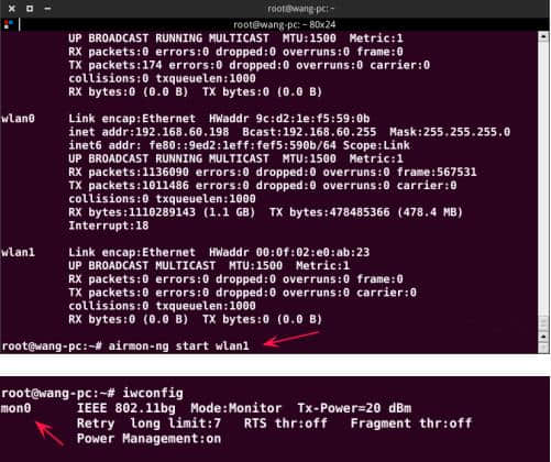 1.使用命令airmon-ng start将无线网卡切换到监控模式。