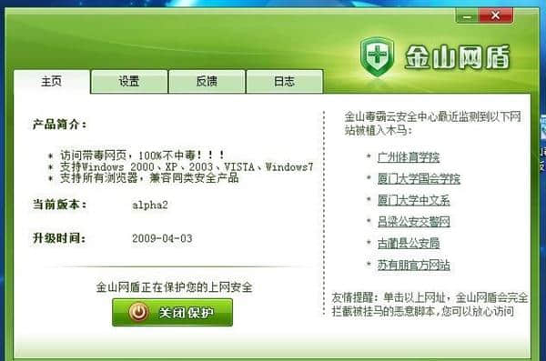 金山网盾免费版免费下载是属于安全相关的一款一款永久免费互联网浏览网页安全防护电脑软件,创佳软件园小编分享给大家金山网盾软件下载和金山网盾使用介绍,相信你正在寻找这样的软件,这款金山网盾v3.6.7小编还亲测了使用过程,欢迎点击下载体验!