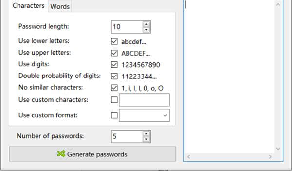 1.根据指定的字符和规则自定义输出格式设置,点击生成5组生成的随机密码。